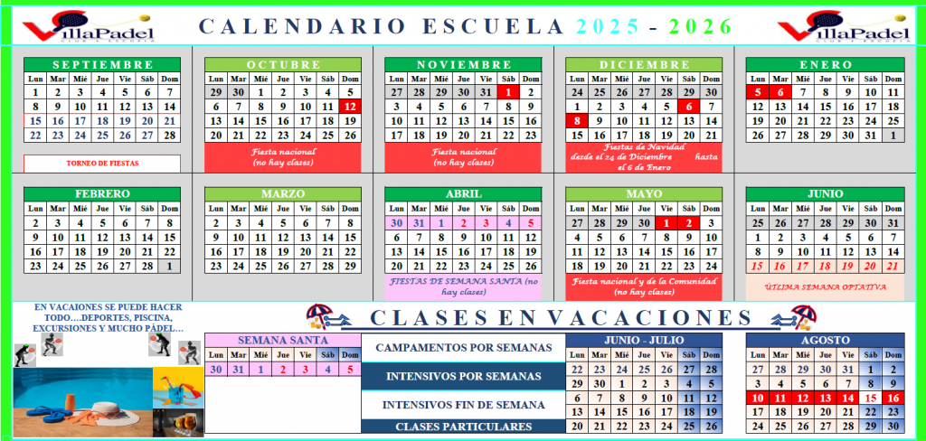 ·        CALENDARIO: En el calendario adjunto, quedarán diferenciados los días lectivos, de los días festivos y periodos vacacionales (navidades, semana santa, fiestas nacionales, etc.)